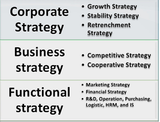 Generally speaking there levels of strategy for a well established MNC viz,, what , why and how about the business that it is in. What is answered by the Corporate level why is answered by the Business Unit level and how is answered by the Functional level strategies. Of late, some authors talk about a fourth level of strategy called operational level strategy.